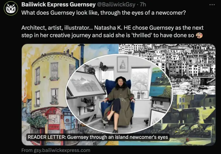 “What does Guernsey look like, through the eyes of a newcomer? Architect, artist, illustrator… Natasha K. HE chose Guernsey as the next step in her creative journey and said she is ‘thrilled’ to have done so.” – Bailiwick Express Guernsey,